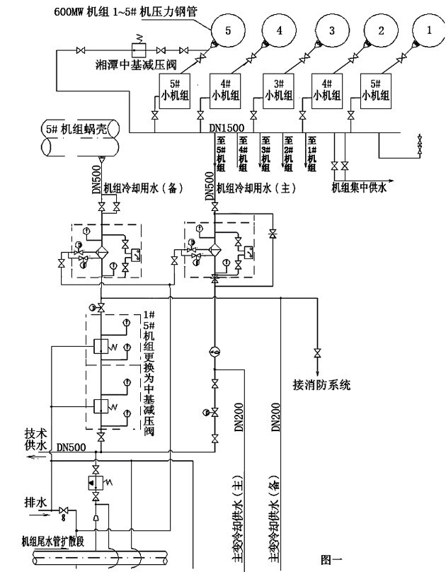 3.1機組技術供水系統(如下圖一所示)設計采用技術供水水源機組(小機)集中供水和單機單元自流減壓供水的混合供水方式,其中一路是采用5臺水源機組發電減壓后的尾水集中匯流至匯流母管,從匯流母管上分別引出5路供水作為600MW機組的技術供水主用水源,另一路采用600MW機組鋼管取水通過自流減壓后作為600MW機組的技術供水備用水源。