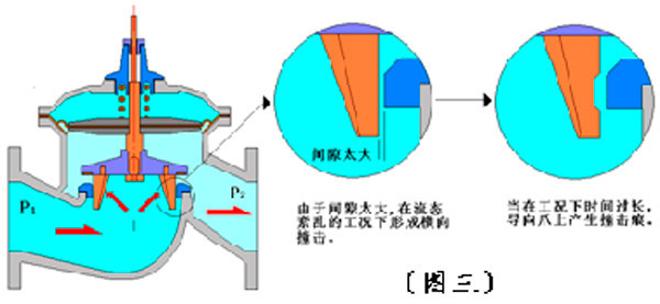 從減壓閥的過流方式分析:水流沿節流錐流向出口,有效地減少了紊流現象,有利于P2的穩定性和低噪聲。如圖六所示。