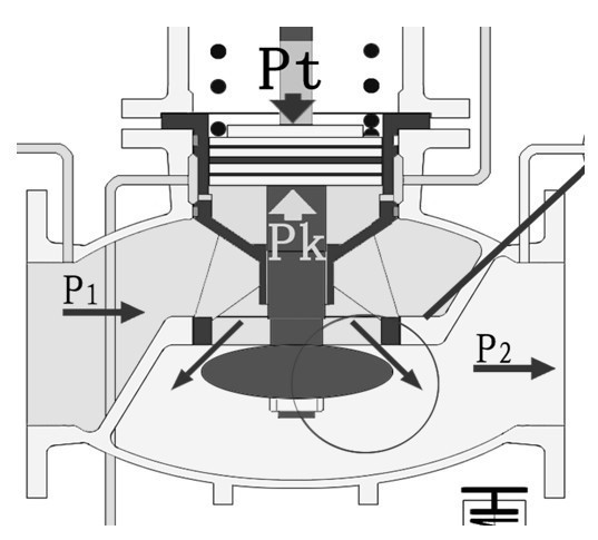 當P1上升時,減壓閥的P2+ΔP2首先表現為上升,其值通過反饋系統出口管傳到控制閥,使Pt′+ΔPt′,ΔPt′與Pk′的力達到新的平衡,控制閥h減?。幌鄳k′壓力增大,經壓力導管,使主閥的Pk+ΔPk,Pt=Pk+ΔPk壓力達到新的平衡,主閥h減小、ΔP2值恢復為原P2值。當進口壓力P1下降時,主閥與控制閥的工況則與上述的工況相反。