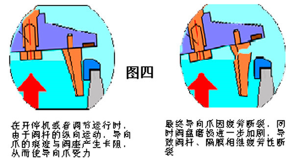 4.2.3終,因機組開停機或流量變化時,導向爪上形成痕跡卡在閥座上,在縱向受力的工況下,導致導向爪、閥桿的彎曲或斷裂。如圖四所示。#5、#4機減壓閥解體檢查看,閥座不銹鋼圈螺栓存在松動、脫落隱患,隔膜碟鎖固螺栓也無安全鎖定措施等,致使減壓閥在使用過程中存在一定的安全風險。