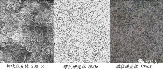 (2)球狀珠光體:經球化退火獲得,滲碳體成球粒狀分布在鐵素體基體上;滲碳體球粒大小,取決于球化退火工藝,特別是冷卻速度。球狀珠光體可分為粗球狀、球狀、細球狀和點狀四種珠光體。