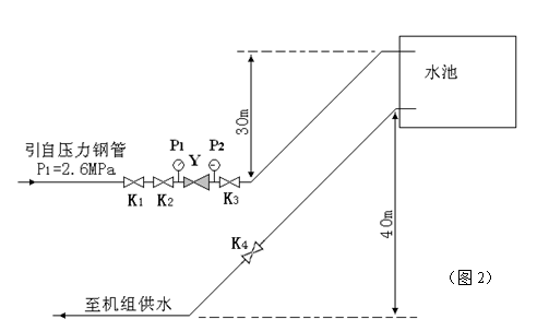 如圖2所示:在壓力鋼管進機組處的位置附近取水。K1、K2分別這取水閥和工作閥,Y為ZJY46H-40C DN150減壓閥。P2的壓力整定為0.6MPa,減壓后的水直供水池,再由水池供兩臺機組用水。調節閥門K3為合適的過流面積。改進前的單臺ZJY46H-40C DN150減壓閥的流量在滿足兩臺機組運行時,運行噪音為118dB。
